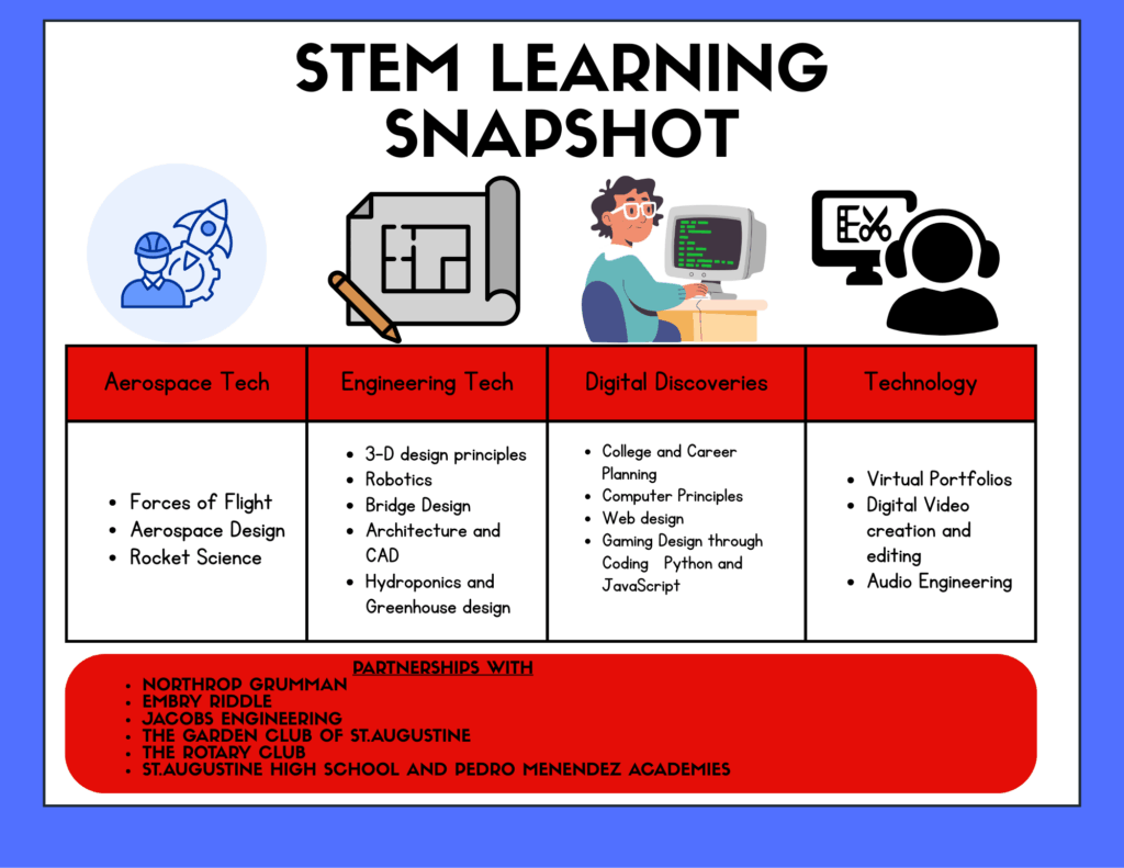 Students work both independently and in teams to explore complex problems and develop meaningful solutions. This collaborative, project-based environment encourages curiosity and resilience, while helping students see how science, technology, engineering, art, and math work together in everyday life.