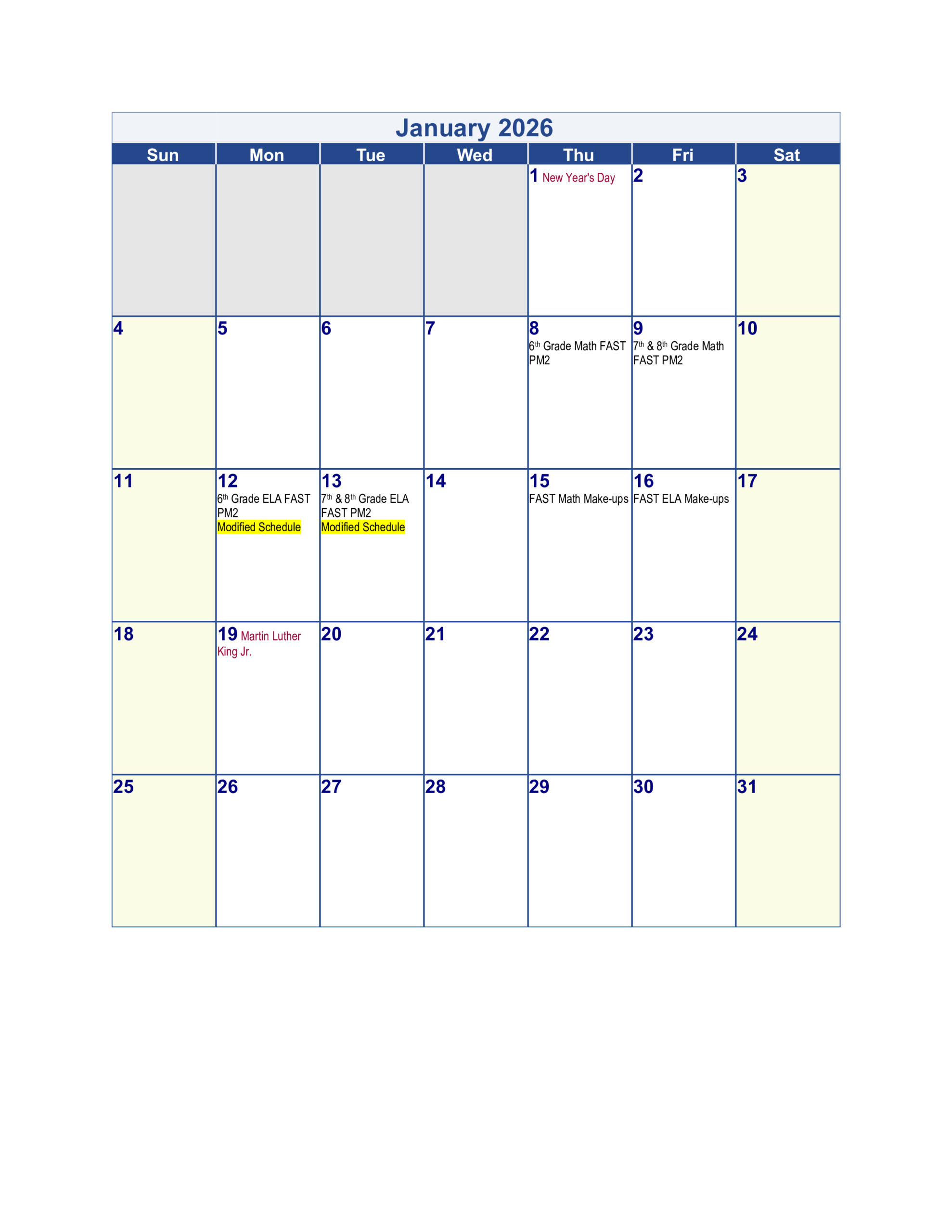 Make-up testing dates are Thursday, January 15 and Friday January 16.